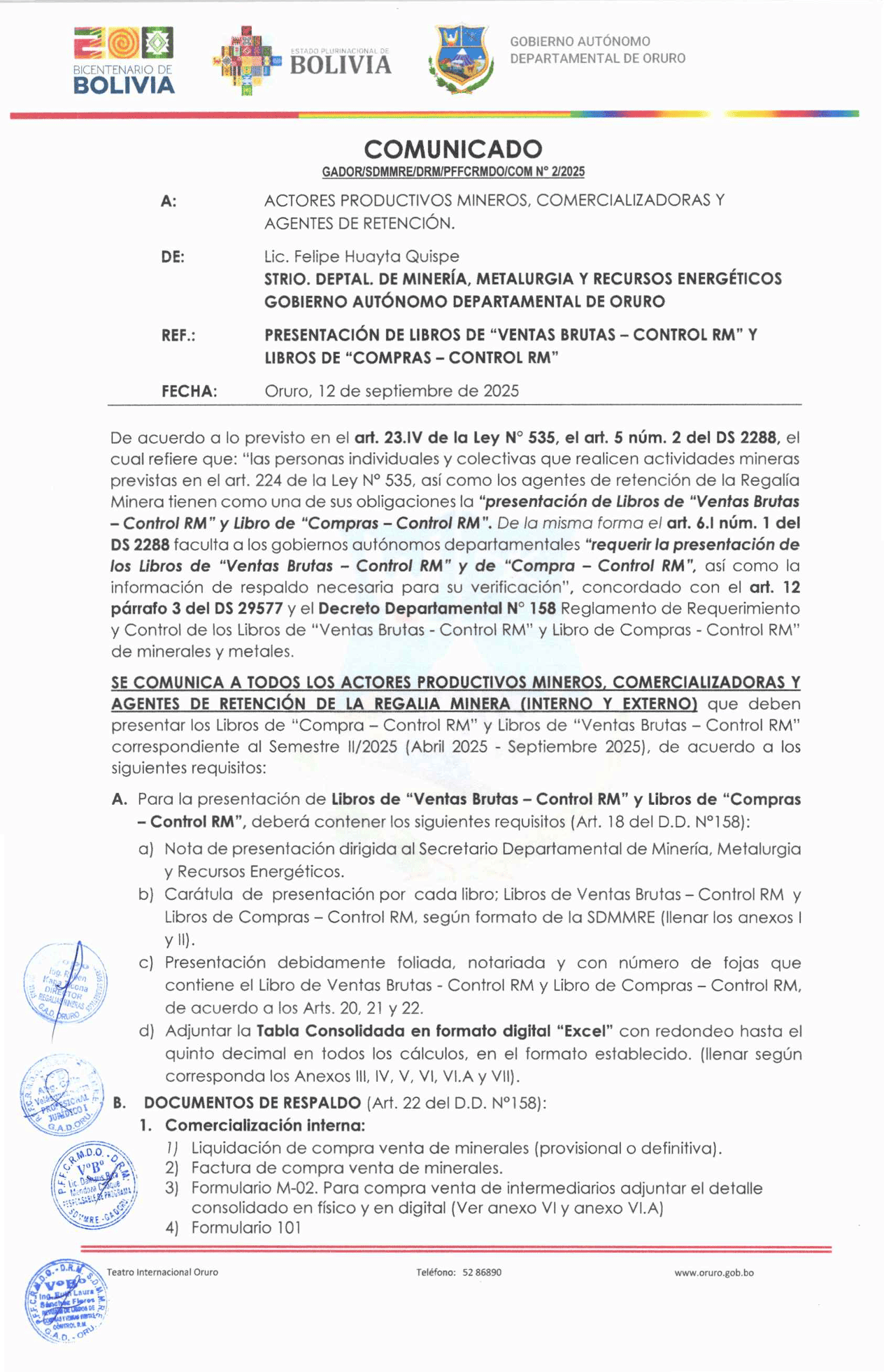 07/03/2025 | POTOSÍ: EN VIRTUD AL CONVENIO INTER GUBERNATIVO DE COOPERACIÓN Y COORDINACIÓN ENTRE EL GOBIERNO AUTÓNOMO DEPARTAMENTAL DE ORURO Y EL GOBIERNO AUTÓNOMO DE POTOSÍ DE FECHA 14/11/2023 | SDMM-URM-LCV N° 01/2025 | PRESENTACION DE LIBROS DE COMPRAS Y VENTAS - CONTROL DE REGALIAS MINERAS SEMESTRE I/2025 |