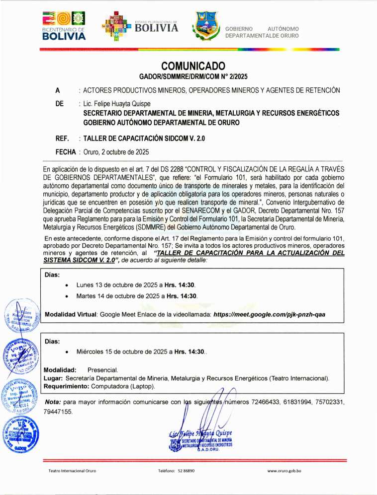 02/10/2025 | DMMRE/DRM/COM Nº 2/2025 | TALLER DE CAPACITACIÓN SIDCOM V. 2.0 | ![]() |